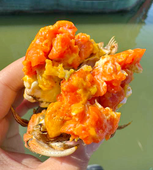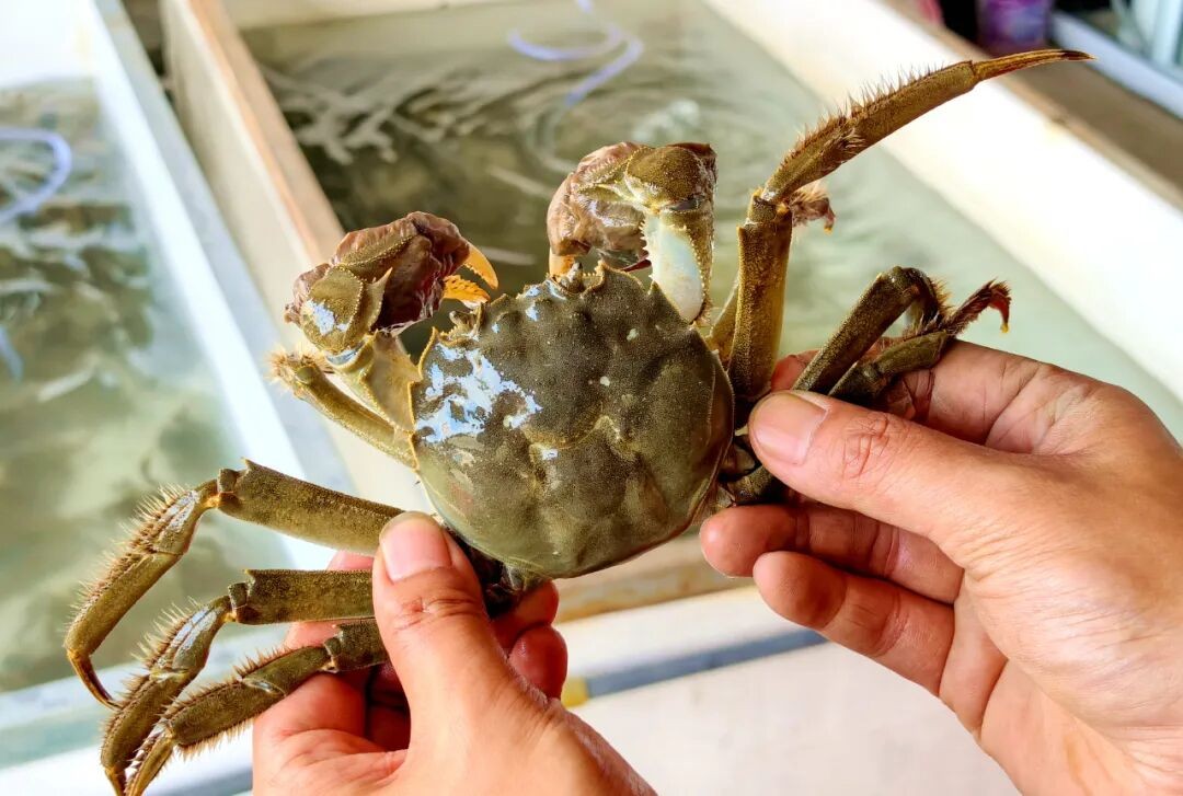 每年9—11月捕捞季,成蟹均重达3.2两以上,母蟹蟹黄占比超35%,公蟹蟹膏凝脂如玉,鲜甜度较普通蟹种提升40%。肉质细嫩、鲜美稍带甜味,蟹腿和蟹钳上的肉饱满、别具风味。当地还通过电商培训拓展线上线下融合销售渠道,带动周边农户增收,形成绿色高效、品牌化运营的生态养殖模式。
